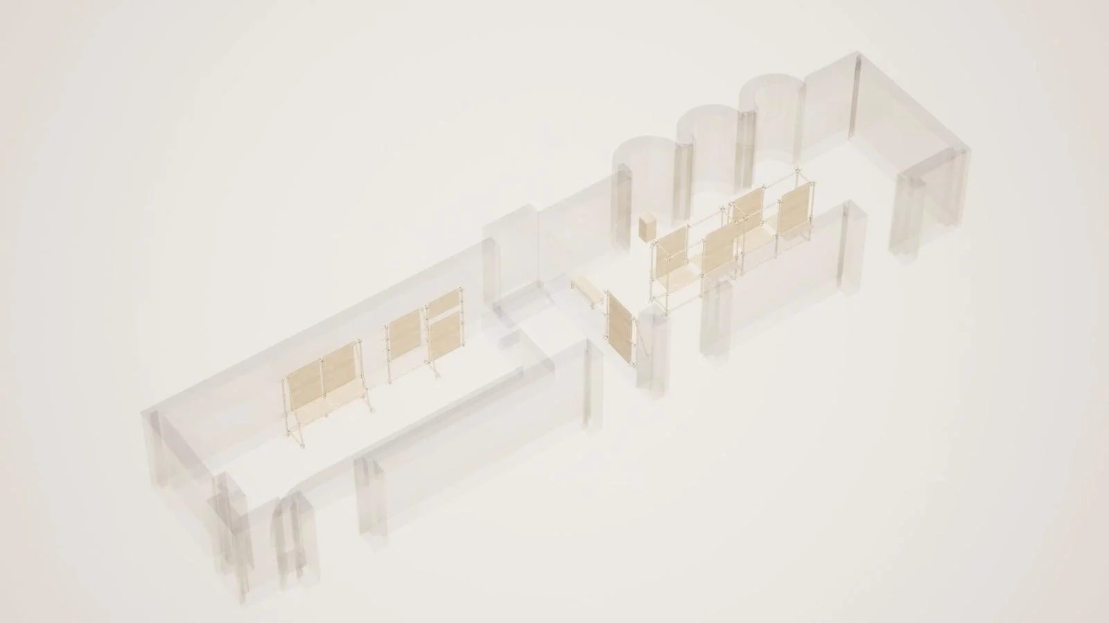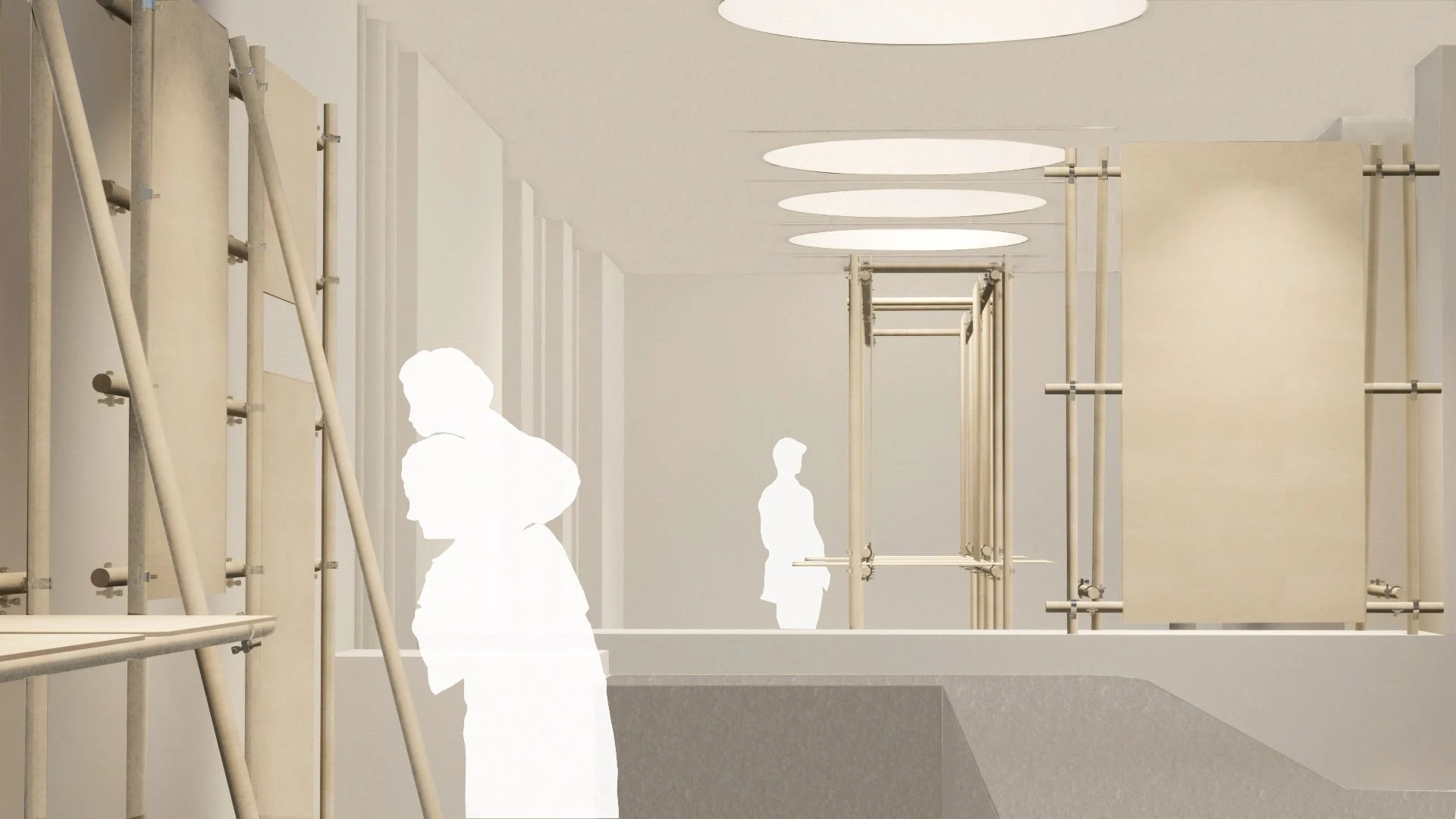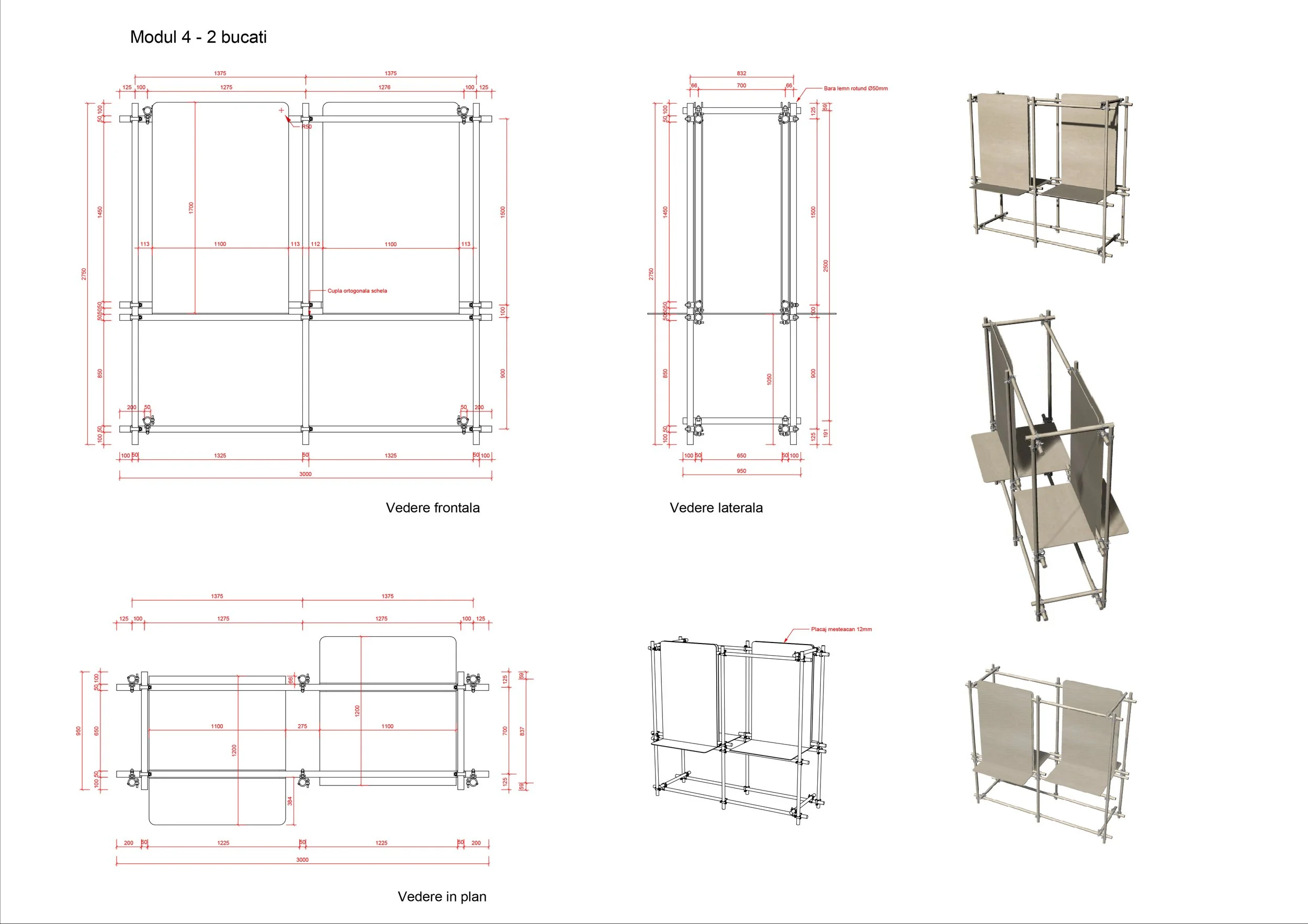 Beyond its functionality, the structure maintains a deliberately experimental aesthetic, evoking the atmosphere of a creative laboratory or a space in continuous transformation. This visual identity, inspired by the idea of “work-in-progress,” reflects the spirit of the exhibition Cluj in Residence, emphasizing exploration, process, and dialogue between artistic forms.