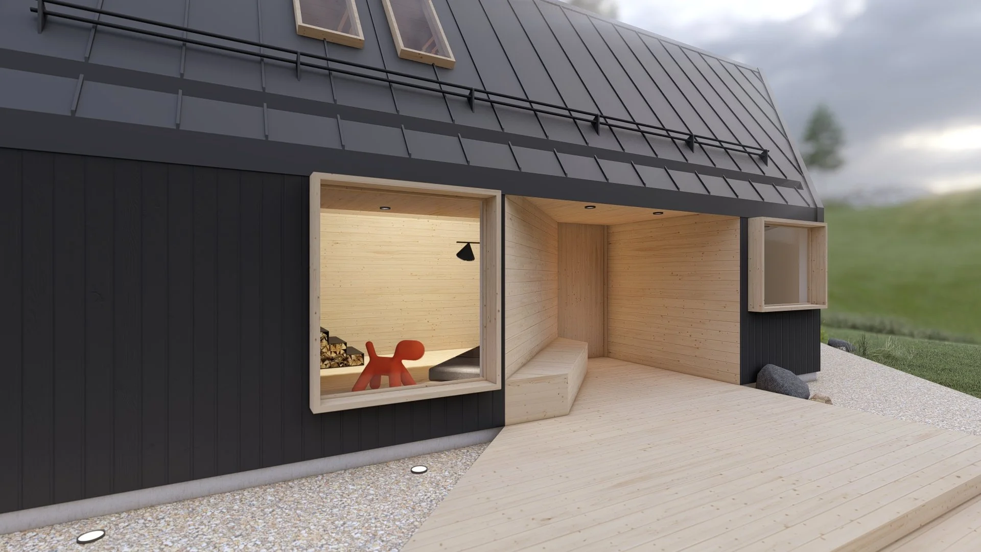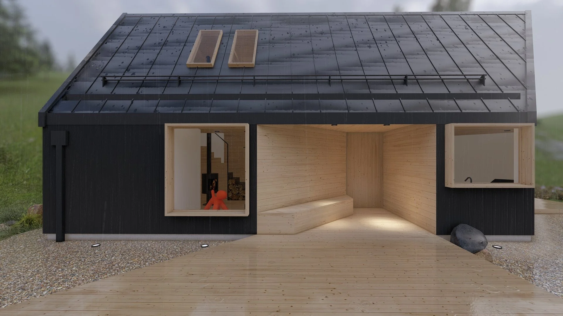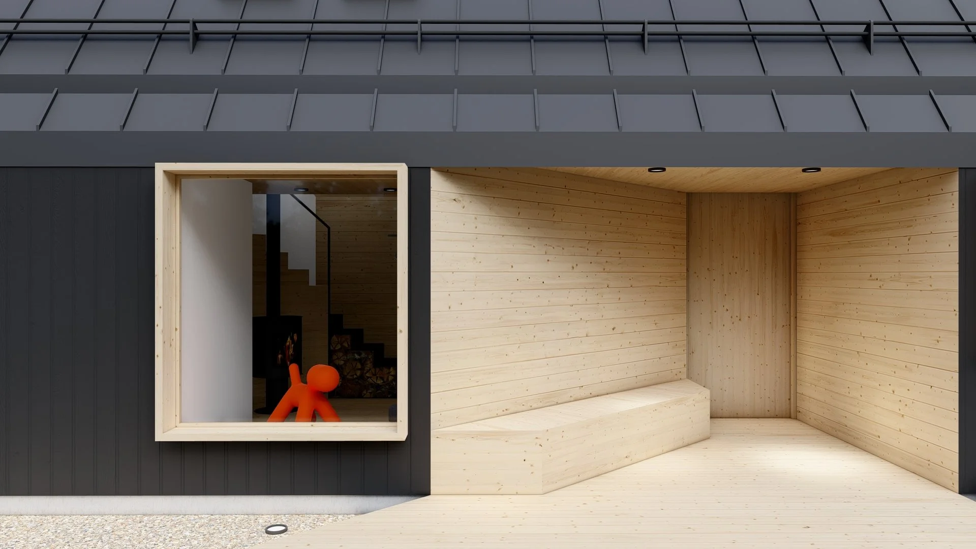 The structure is designed to create a deliberate contrast between inside and outside — the exterior is enclosed, solid, sculptural, and perceived as an object, while the interior is open, filled with natural light, and visually connected to its surroundings through large windows.