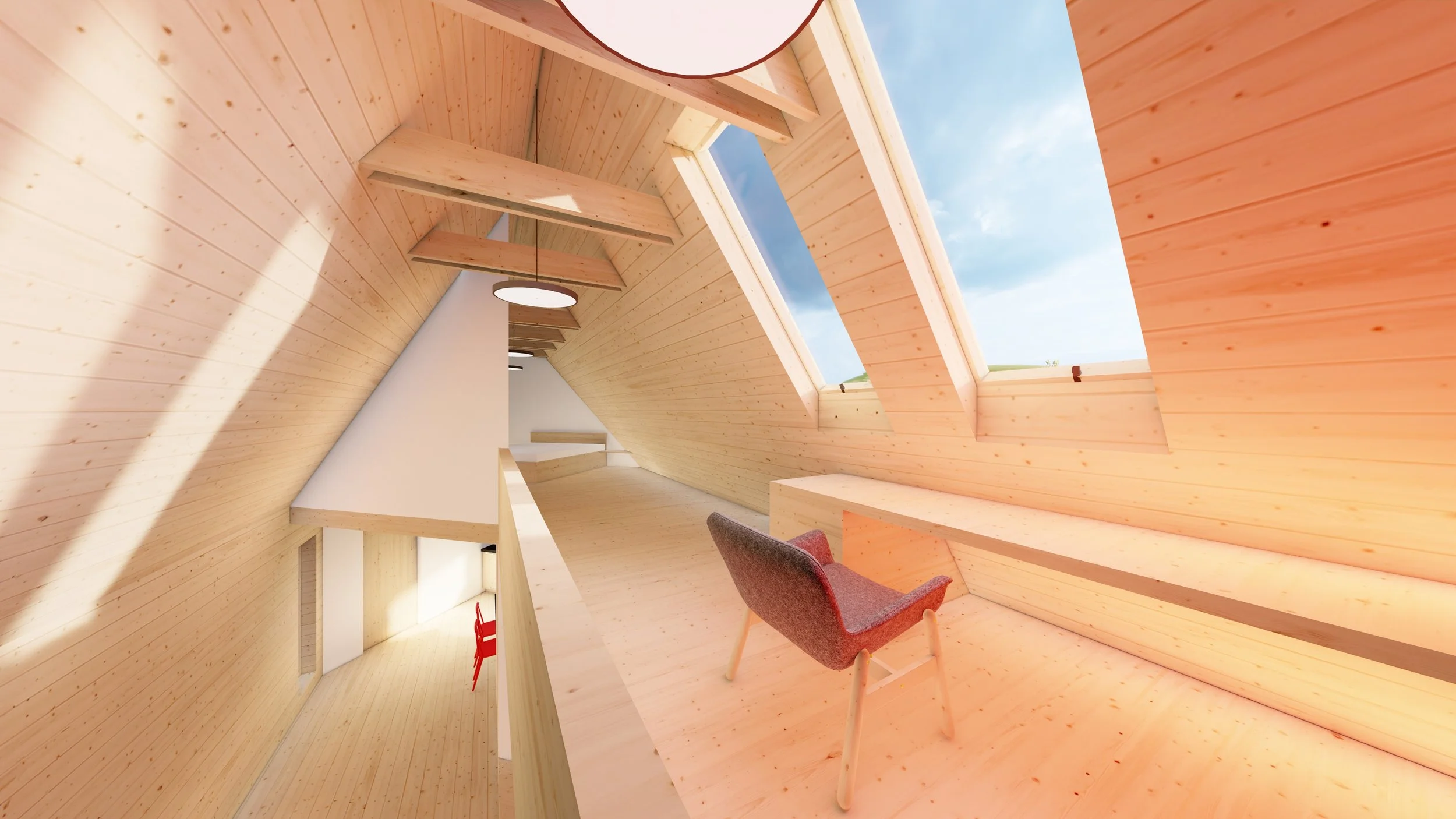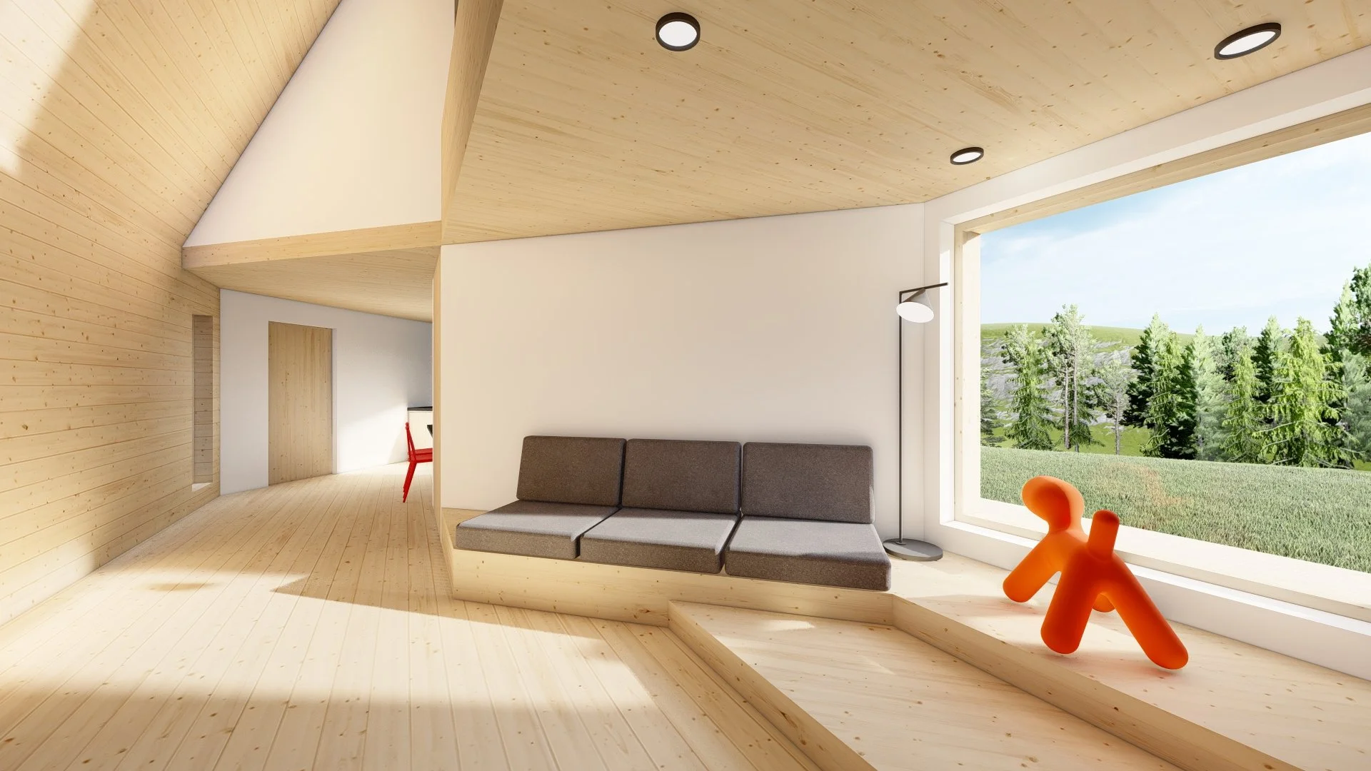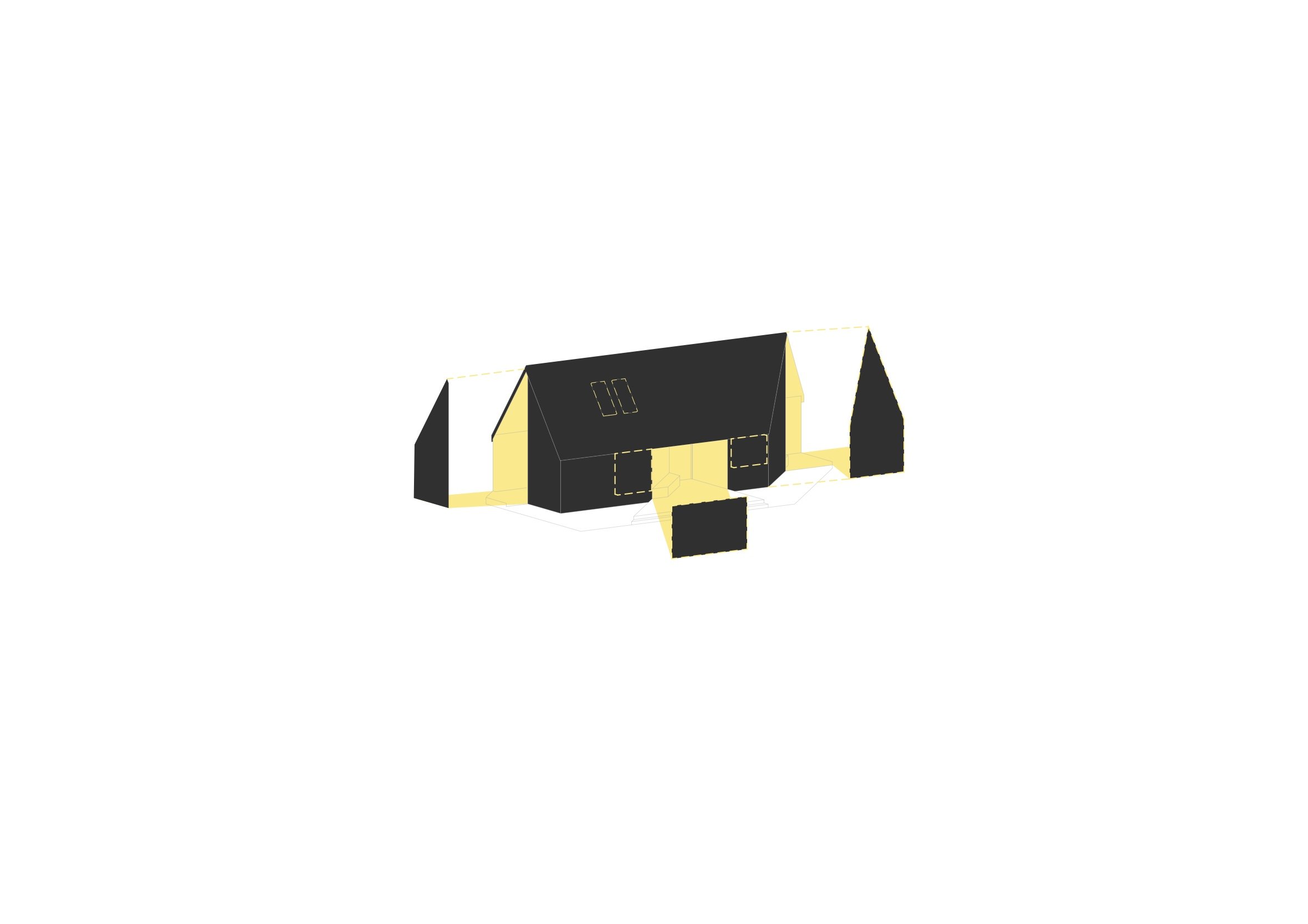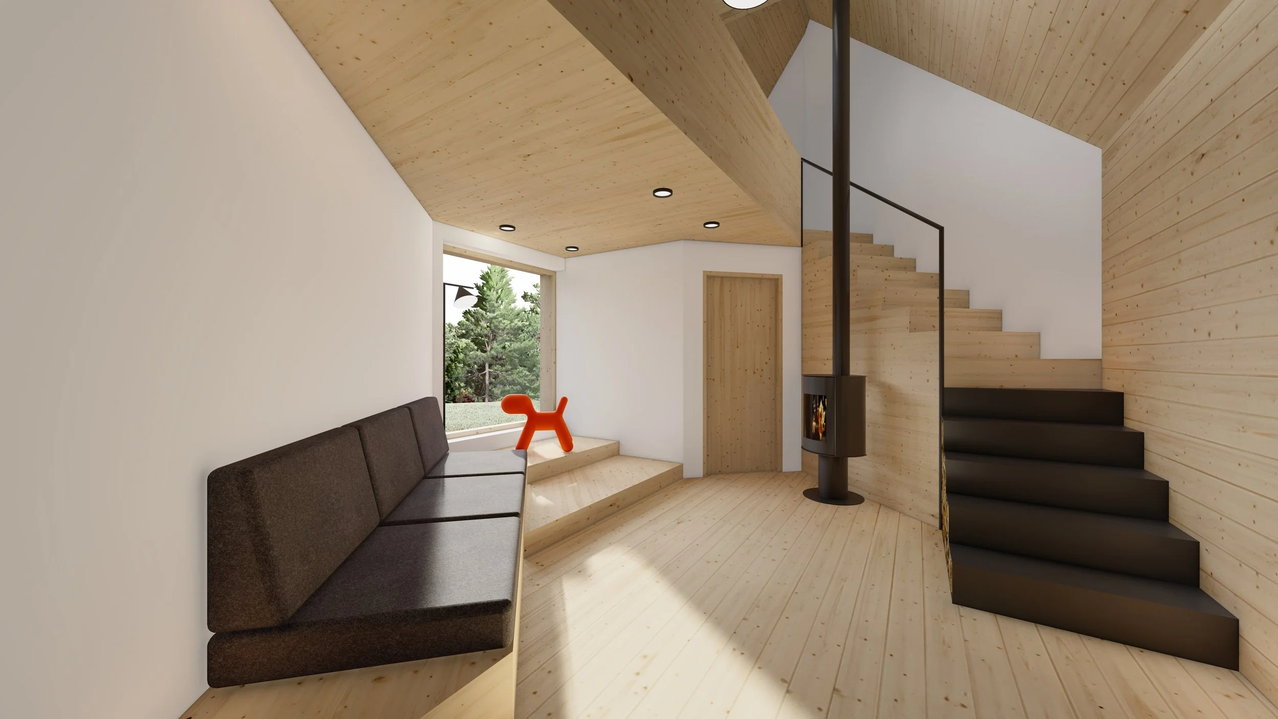 The structure is designed to create a deliberate contrast between inside and outside — the exterior is enclosed, solid, sculptural, and perceived as an object, while the interior is open, filled with natural light, and visually connected to its surroundings through large windows.