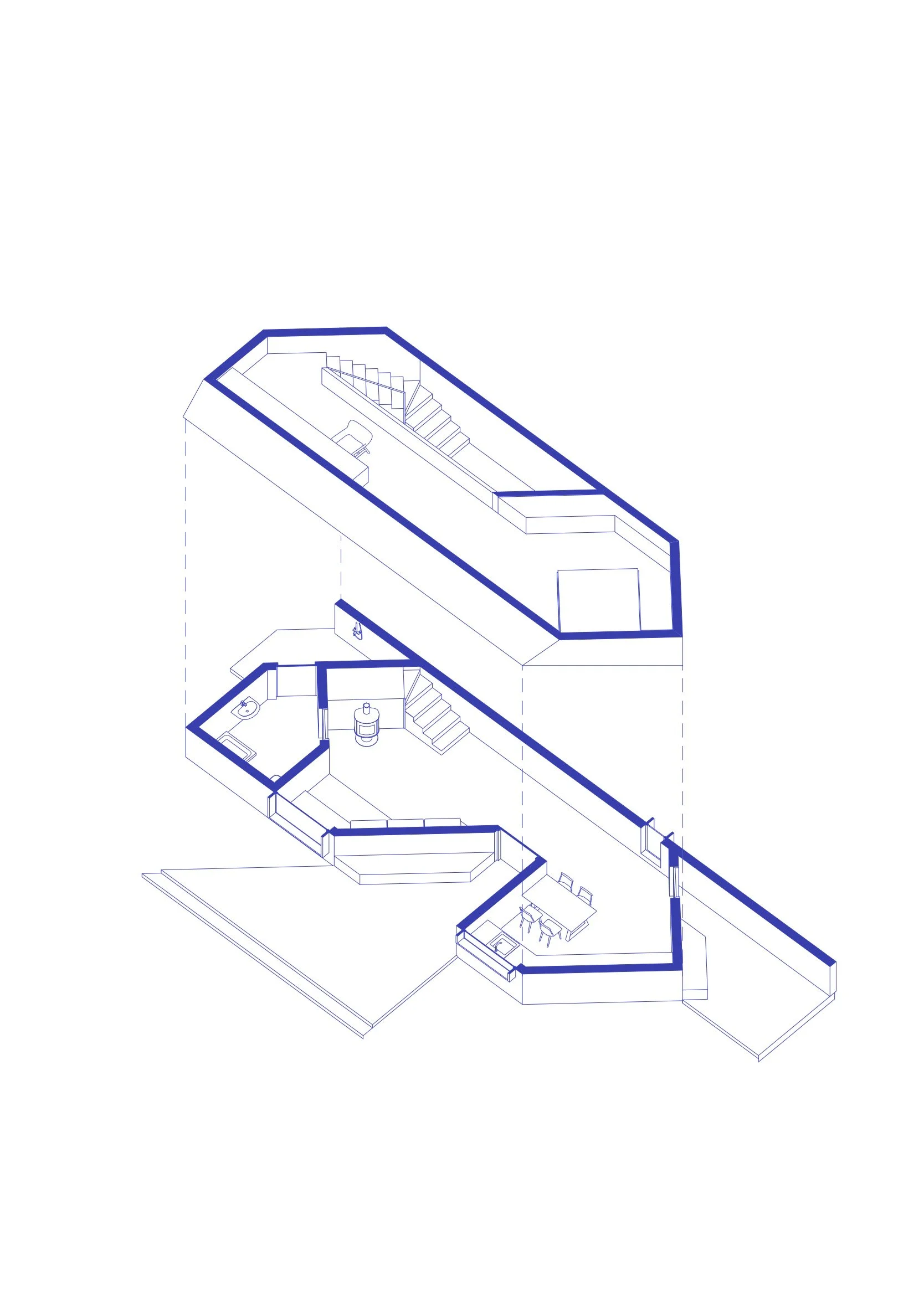 A compact volume containing the essential functions is carved by exterior terraces that reinterpret, in a contemporary way, the traditional prispa as an architectural gesture.