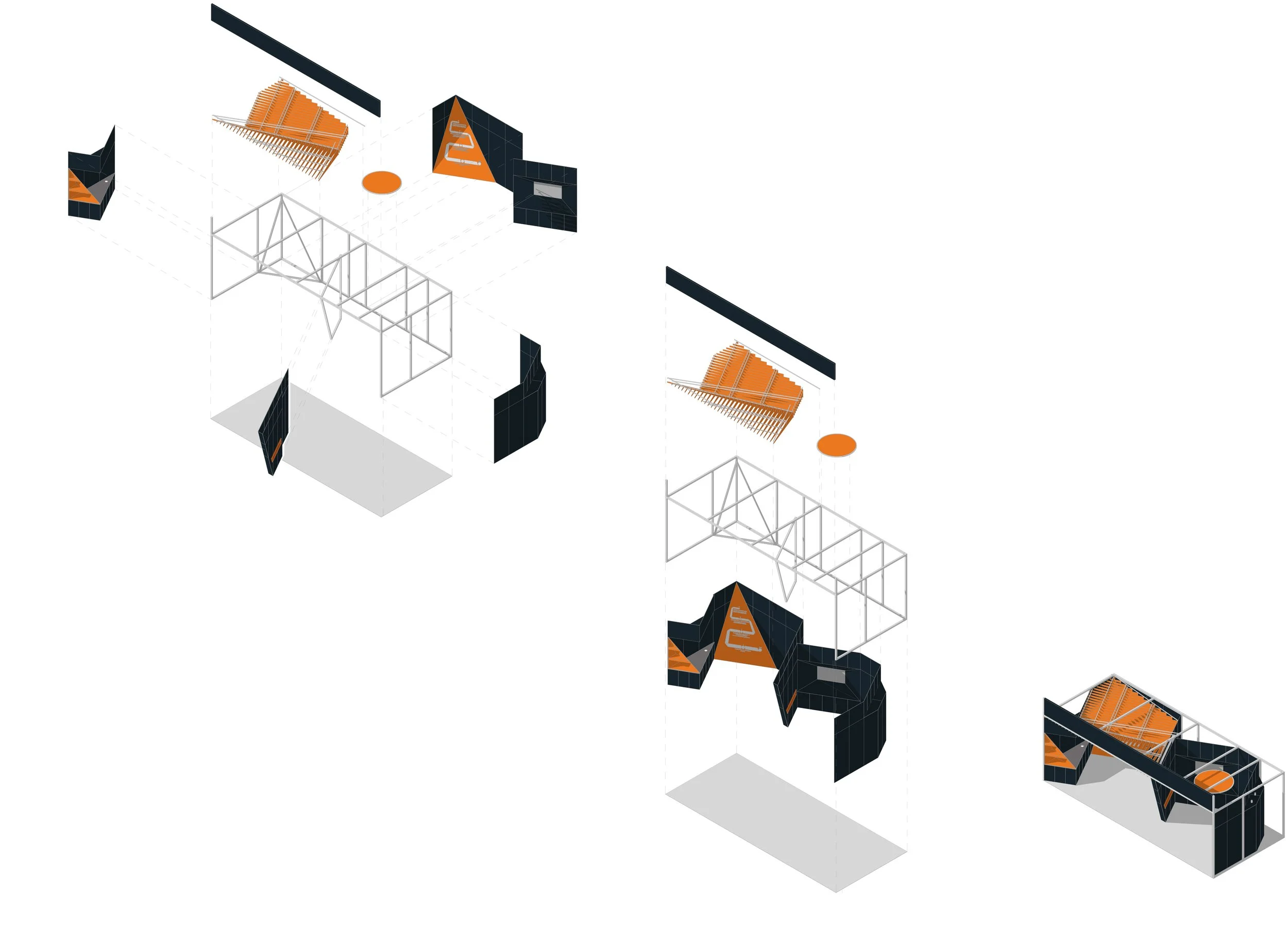 Flexible and adaptable, the stand can be reconfigured to fit different floor layouts while maintaining its impact. The modular structure allows for multiple configurations, tailored to any type of event. The main module measures 5 m x 12 m, while secondary modules can be arranged in formats of 5 m x 5 m, 5 m x 6 m, or 5 m x 3 m..