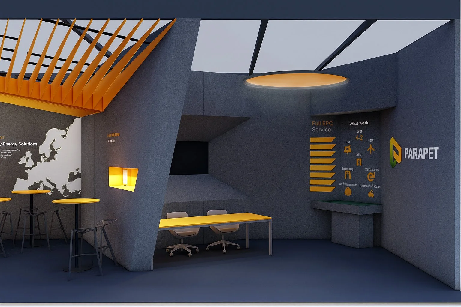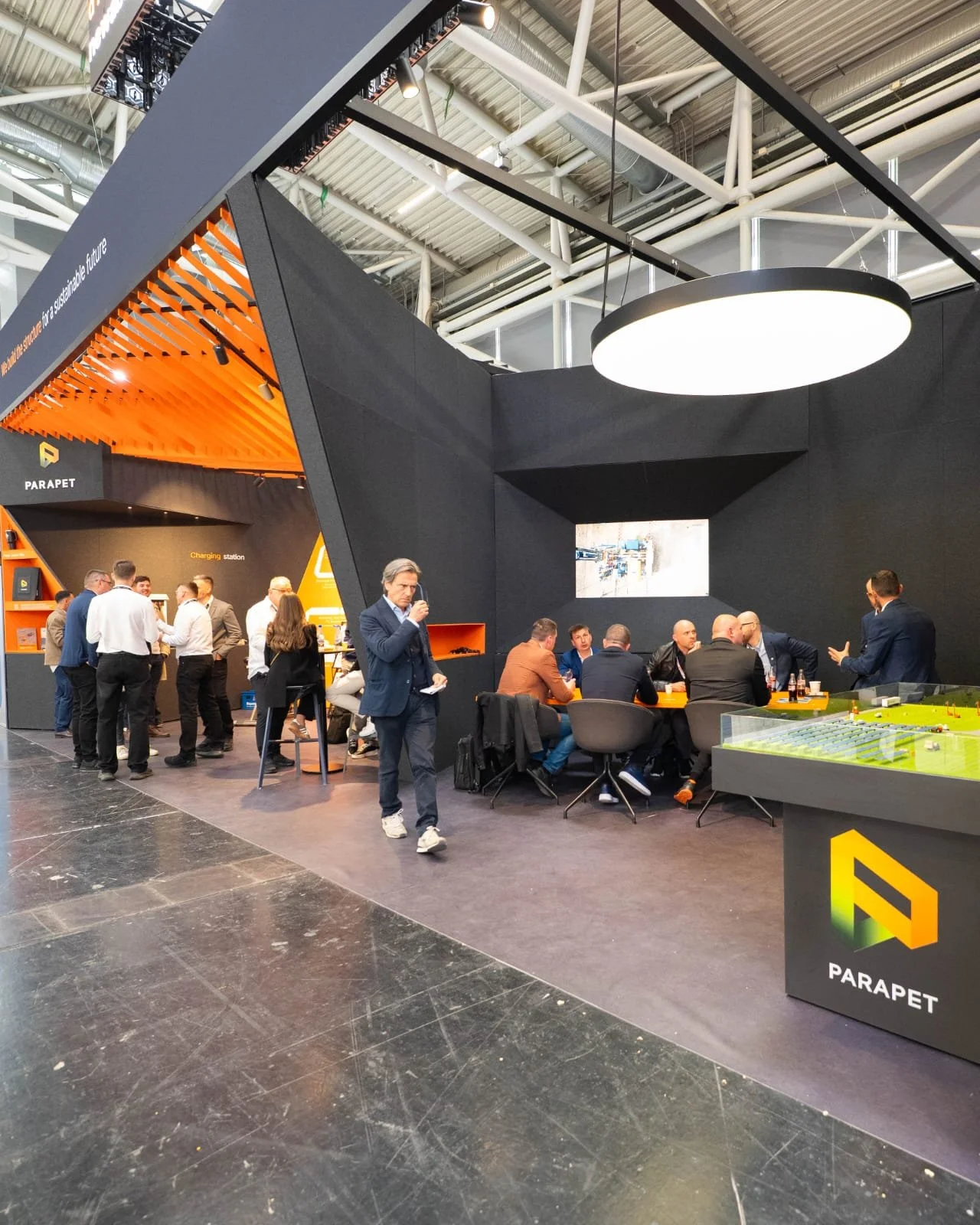 A modular exhibition stand, created to inspire and faithfully reflect the values of Parapet, a company active in the renewable energy sector and energy storage systems.