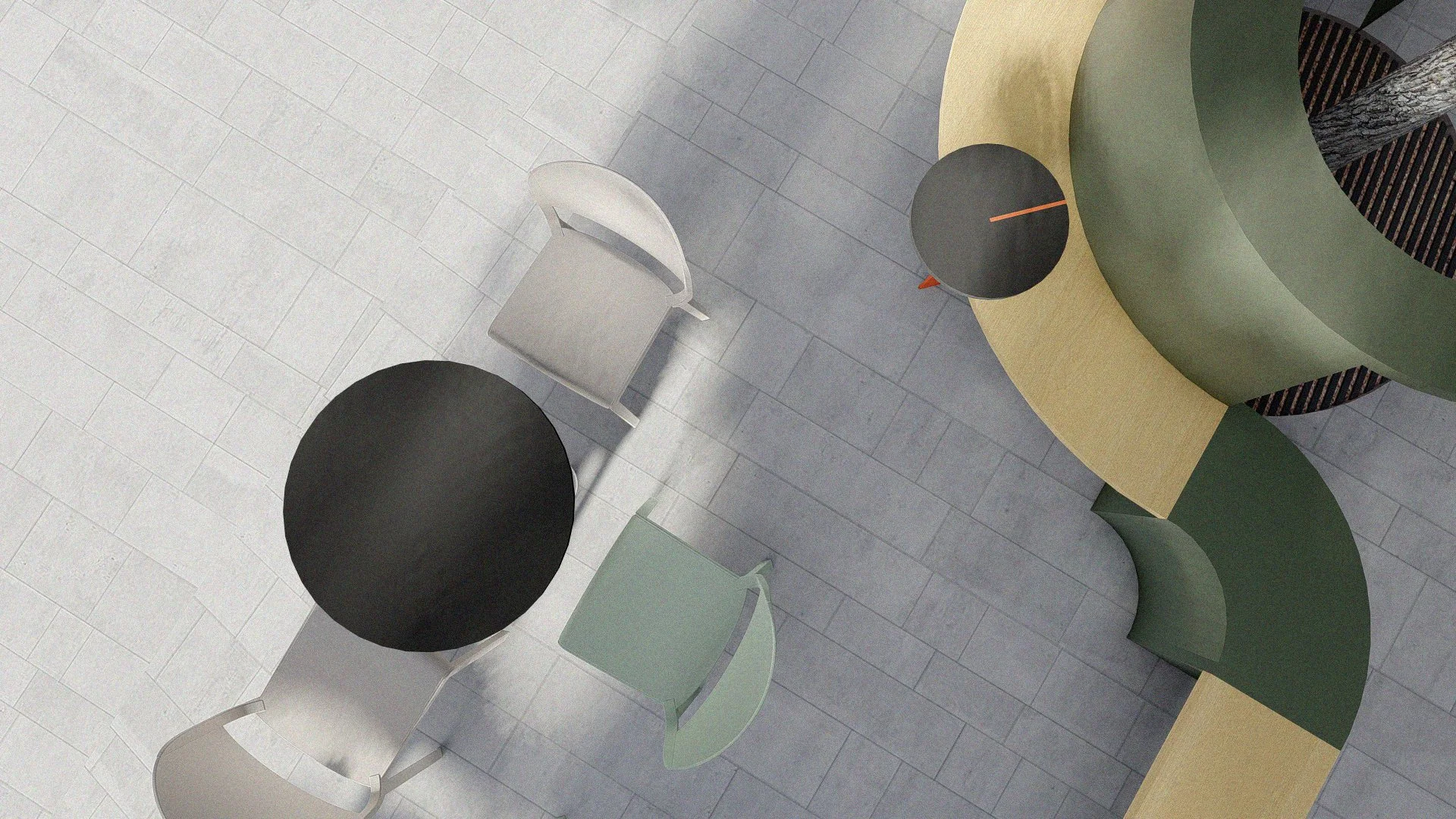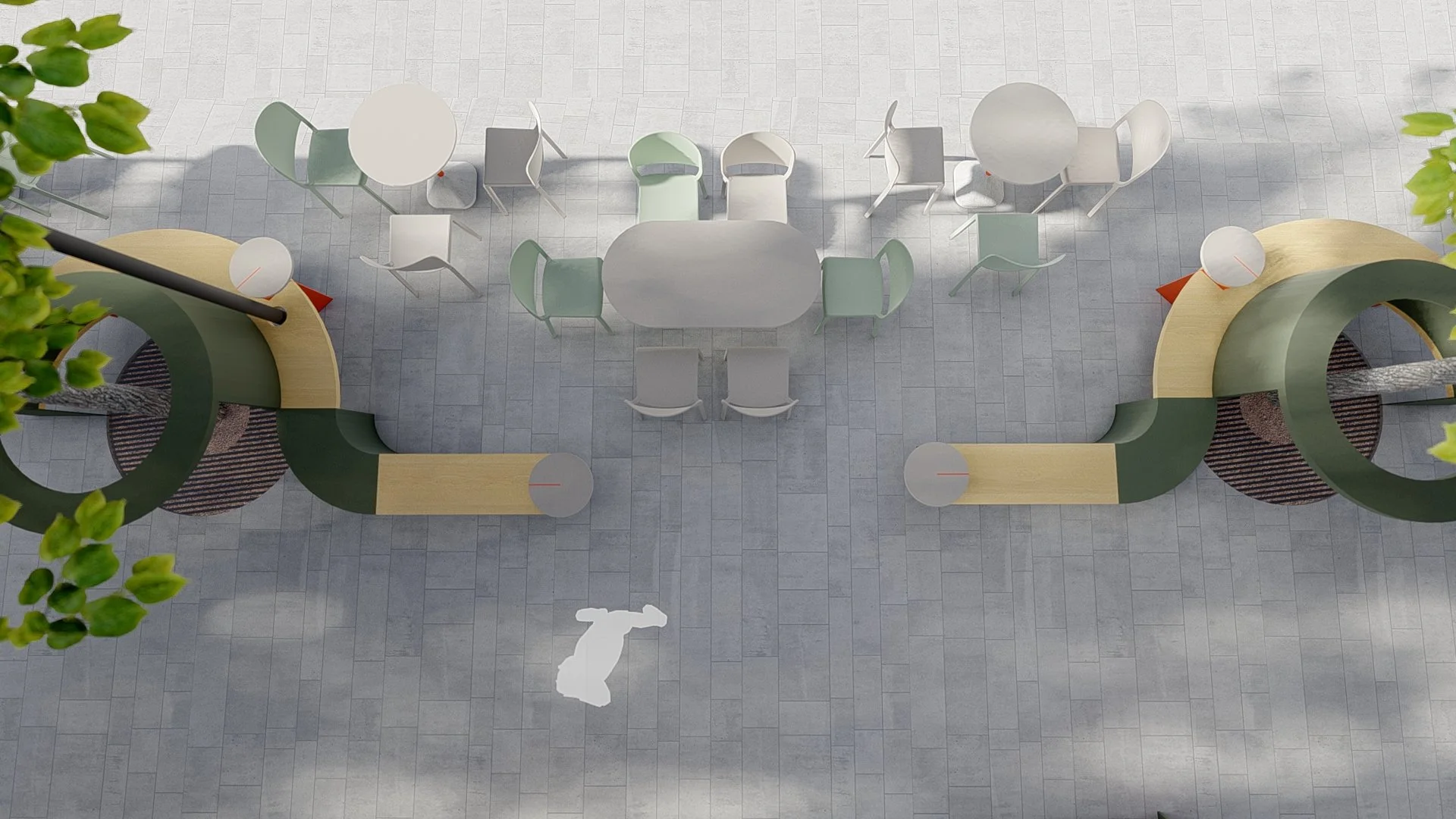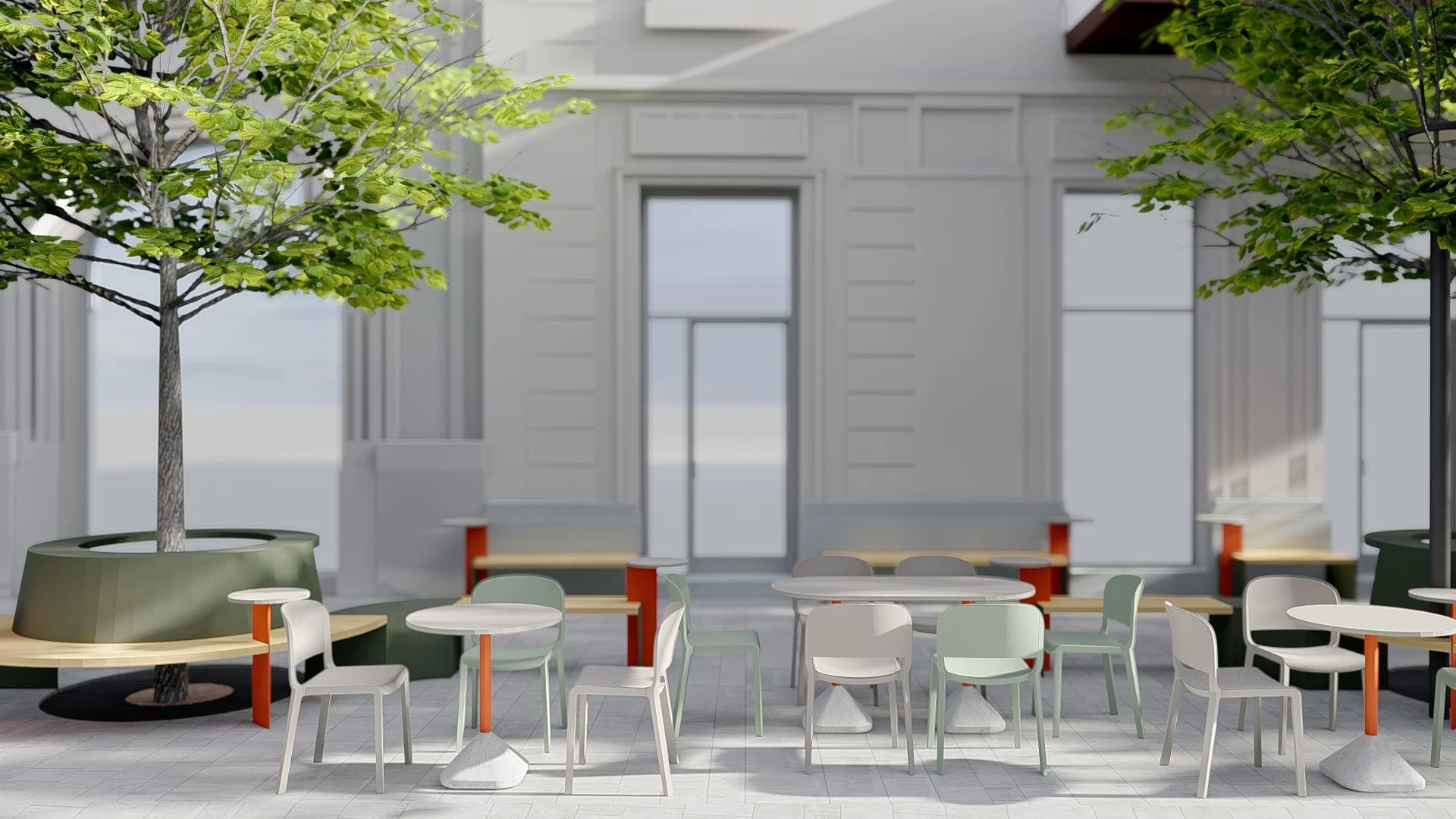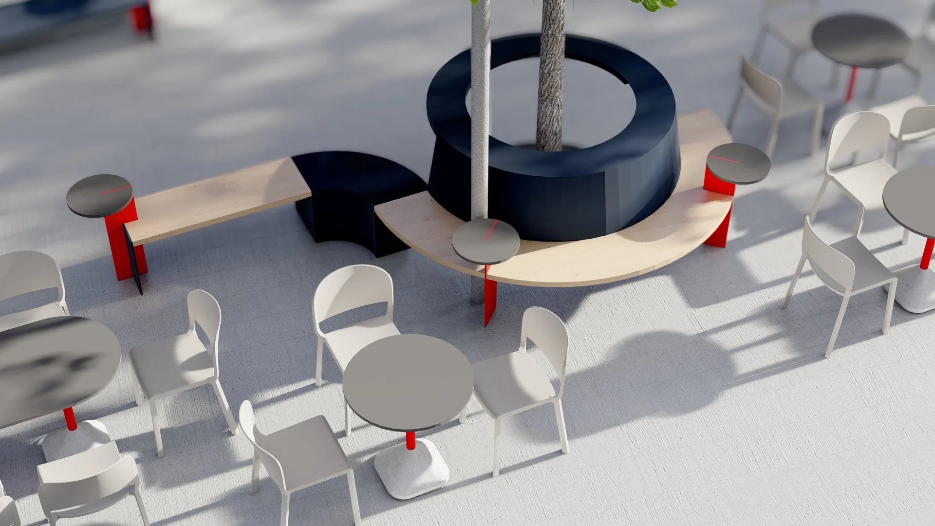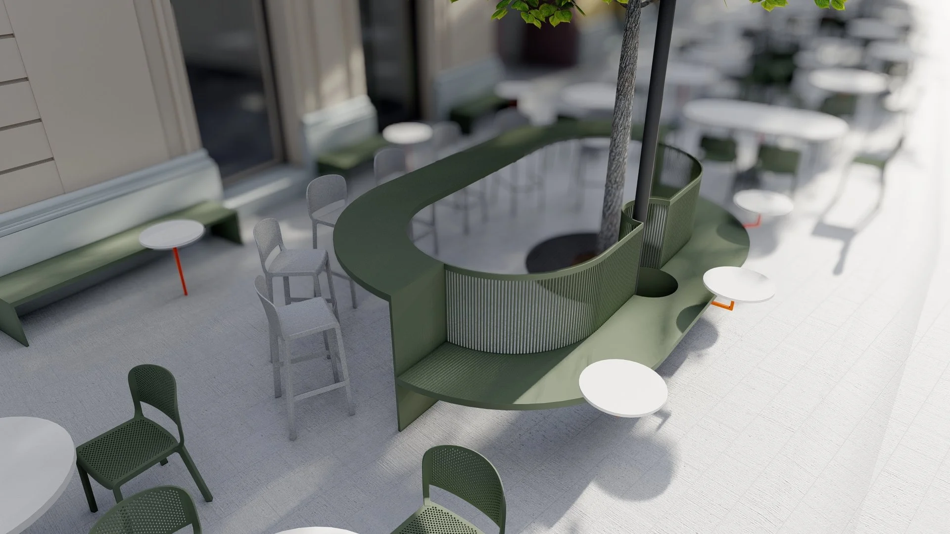 The project aims to respond to the multiple needs that arise in designing the new terrace: spaces for standing conversations, tables for 6 people, as well as for 4 and 2 people, a variety of seating options, and an overall airy and fresh atmosphere. The project includes both “classic” furniture — tables and chairs — but also introduces a dynamic composition through the integration of urban seating objects, conceived as representative landmarks that give identity and character to the Sisters terrace.