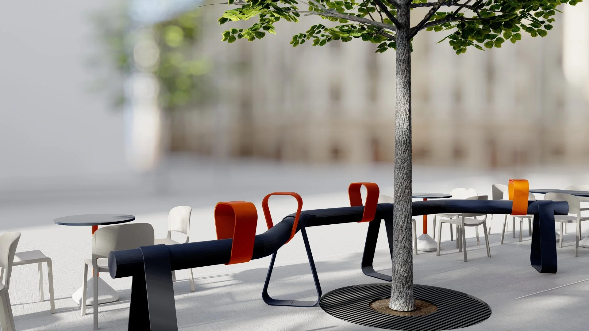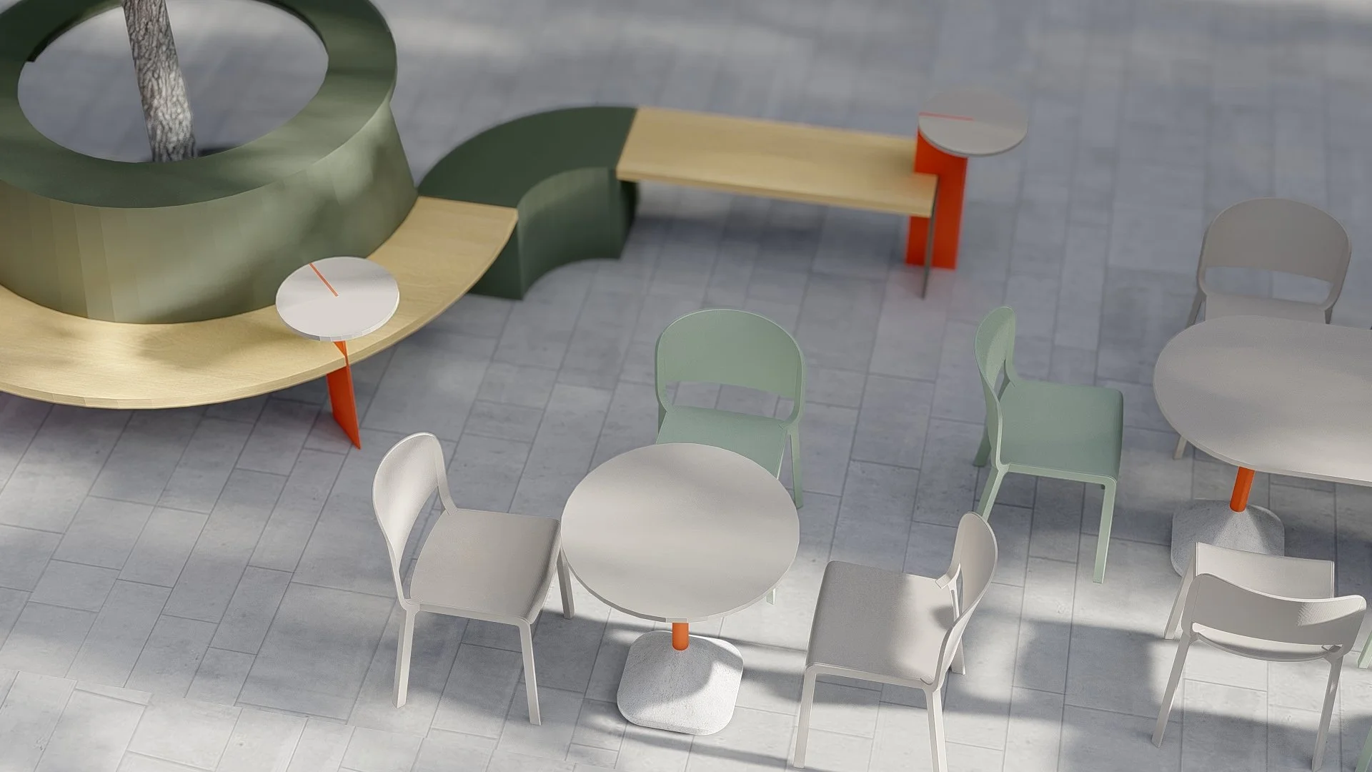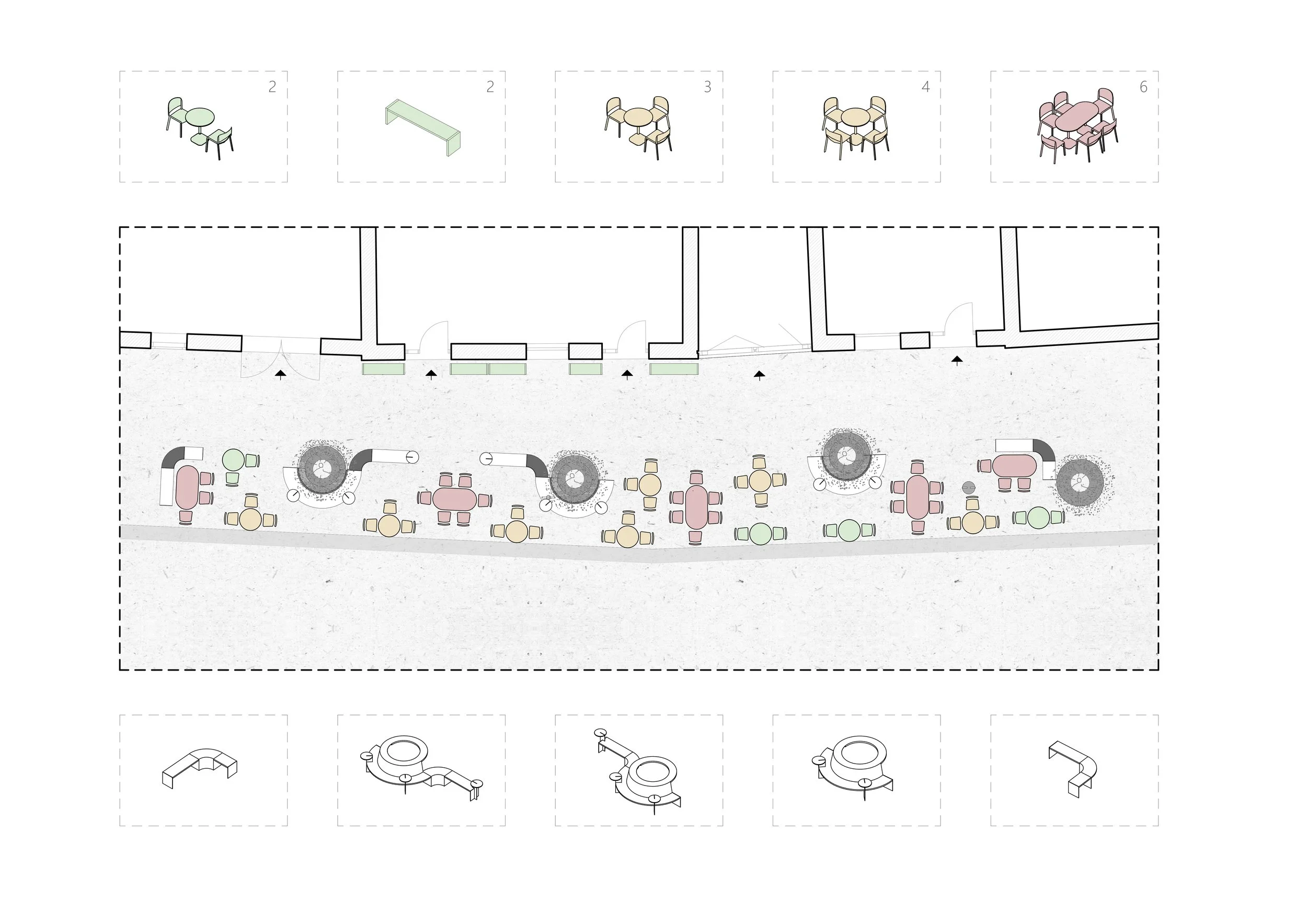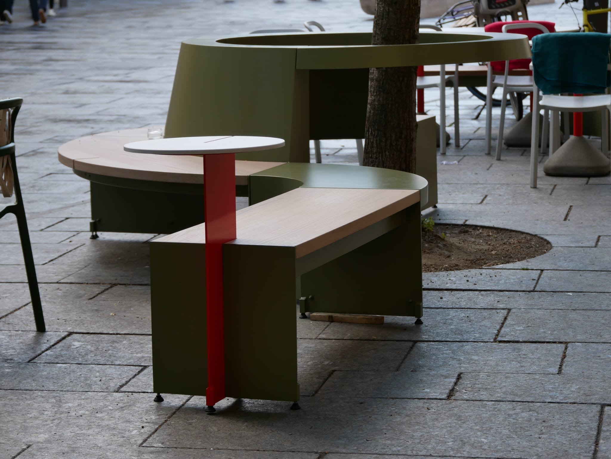 The project aims to respond to the multiple needs that arise in designing the new terrace: spaces for standing conversations, tables for 6 people, as well as for 4 and 2 people, a variety of seating options, and an overall airy and fresh atmosphere. The project includes both “classic” furniture — tables and chairs — but also introduces a dynamic composition through the integration of urban seating objects, conceived as representative landmarks that give identity and character to the Sisters terrace.
