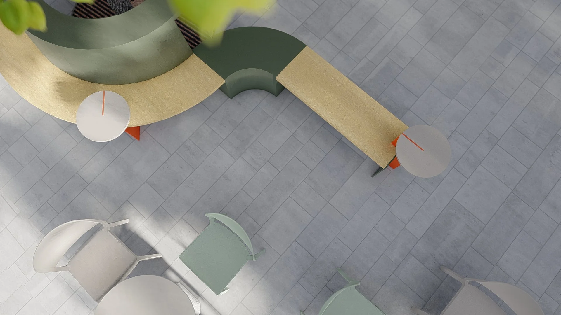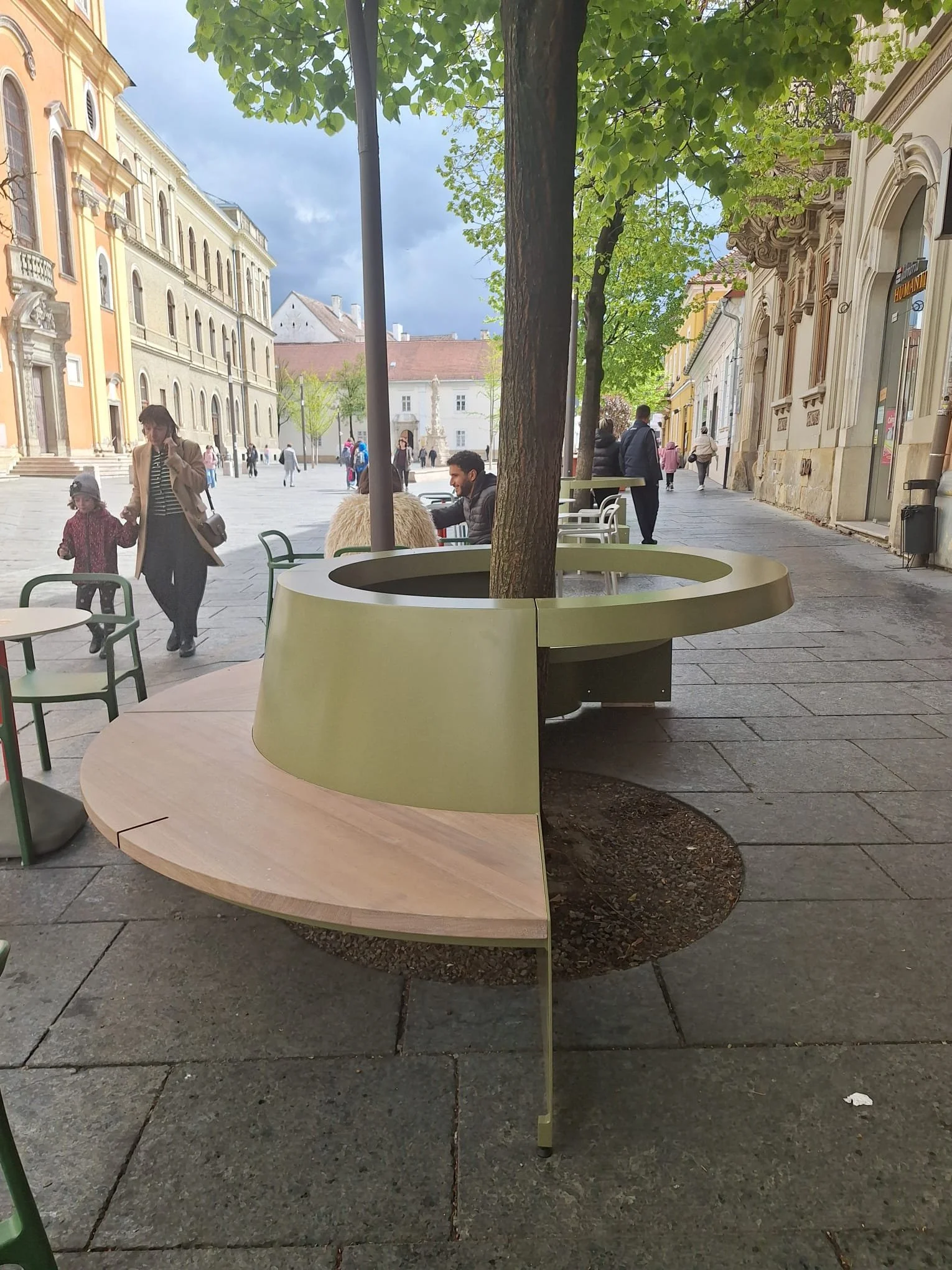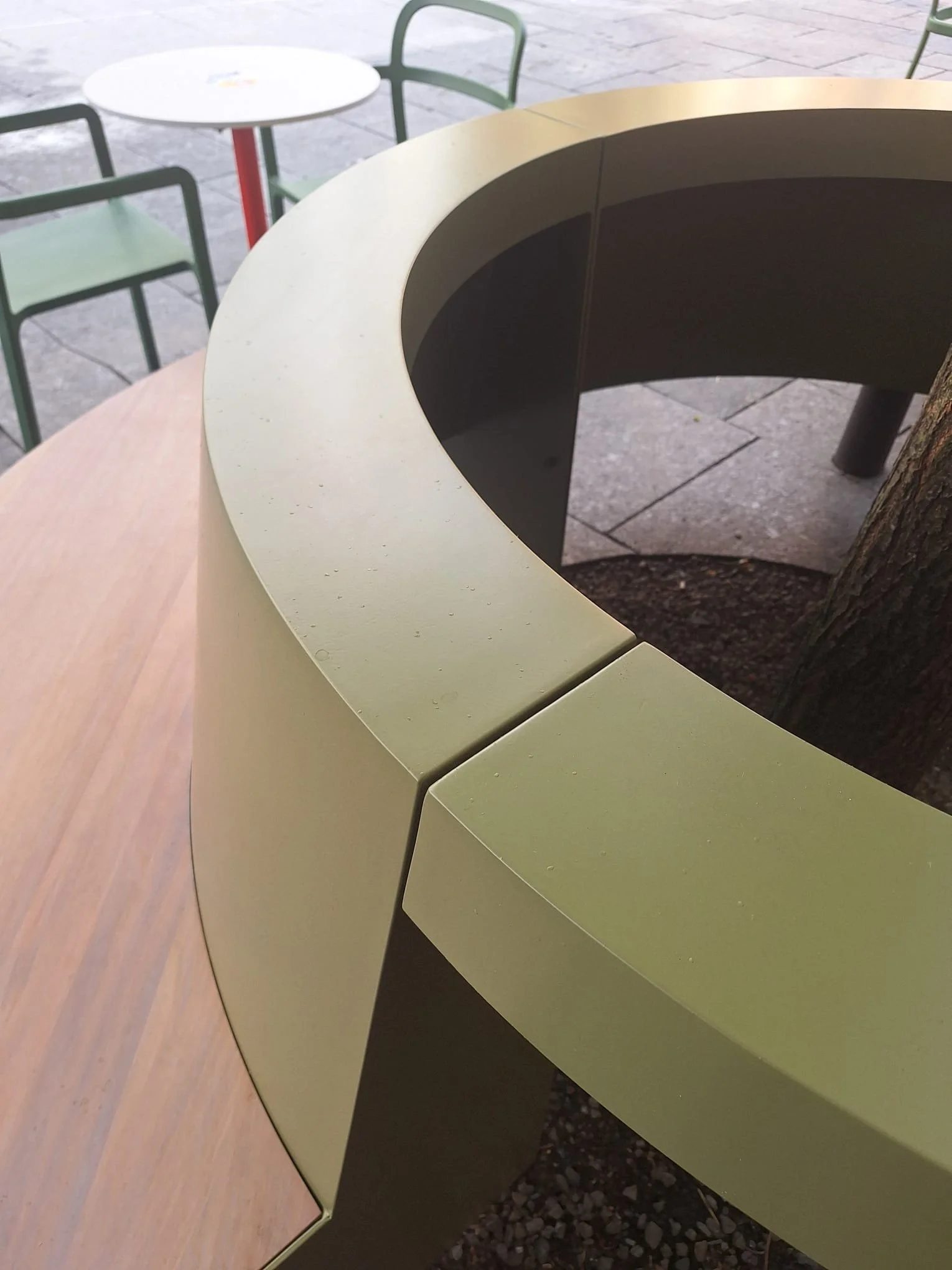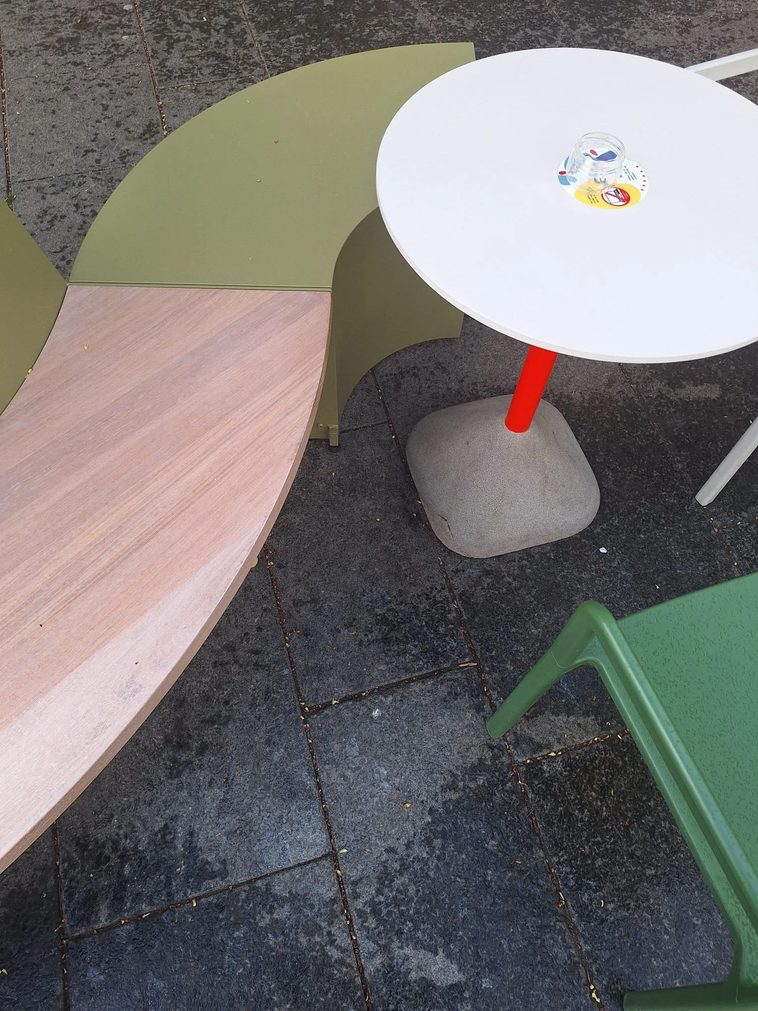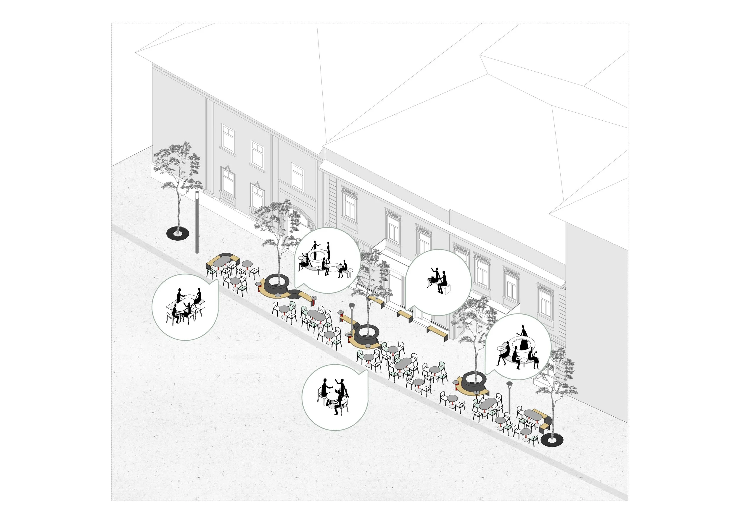 The project aims to respond to the multiple needs that arise in designing the new terrace: spaces for standing conversations, tables for 6 people, as well as for 4 and 2 people, a variety of seating options, and an overall airy and fresh atmosphere. The project includes both “classic” furniture — tables and chairs — but also introduces a dynamic composition through the integration of urban seating objects, conceived as representative landmarks that give identity and character to the Sisters terrace.