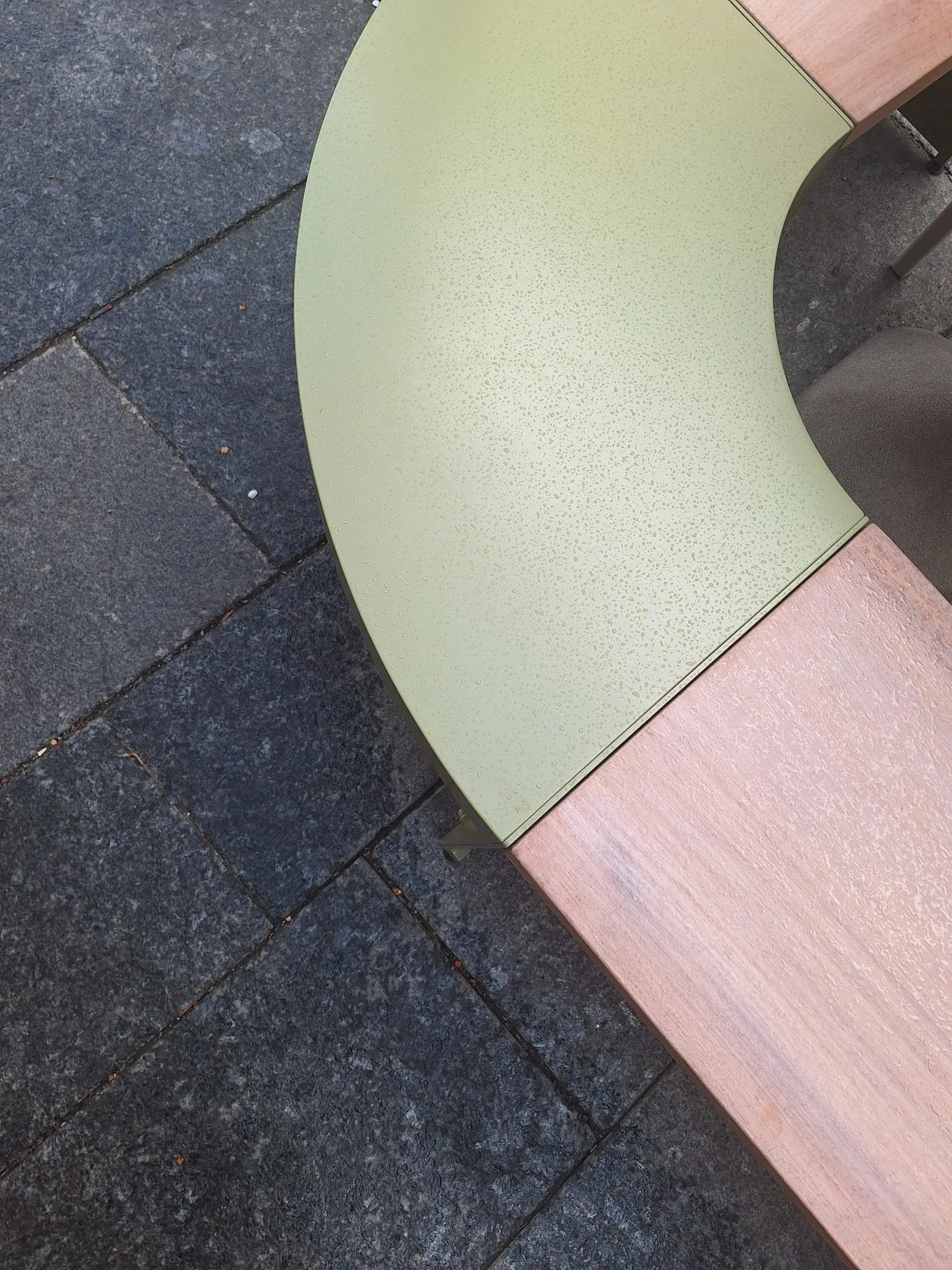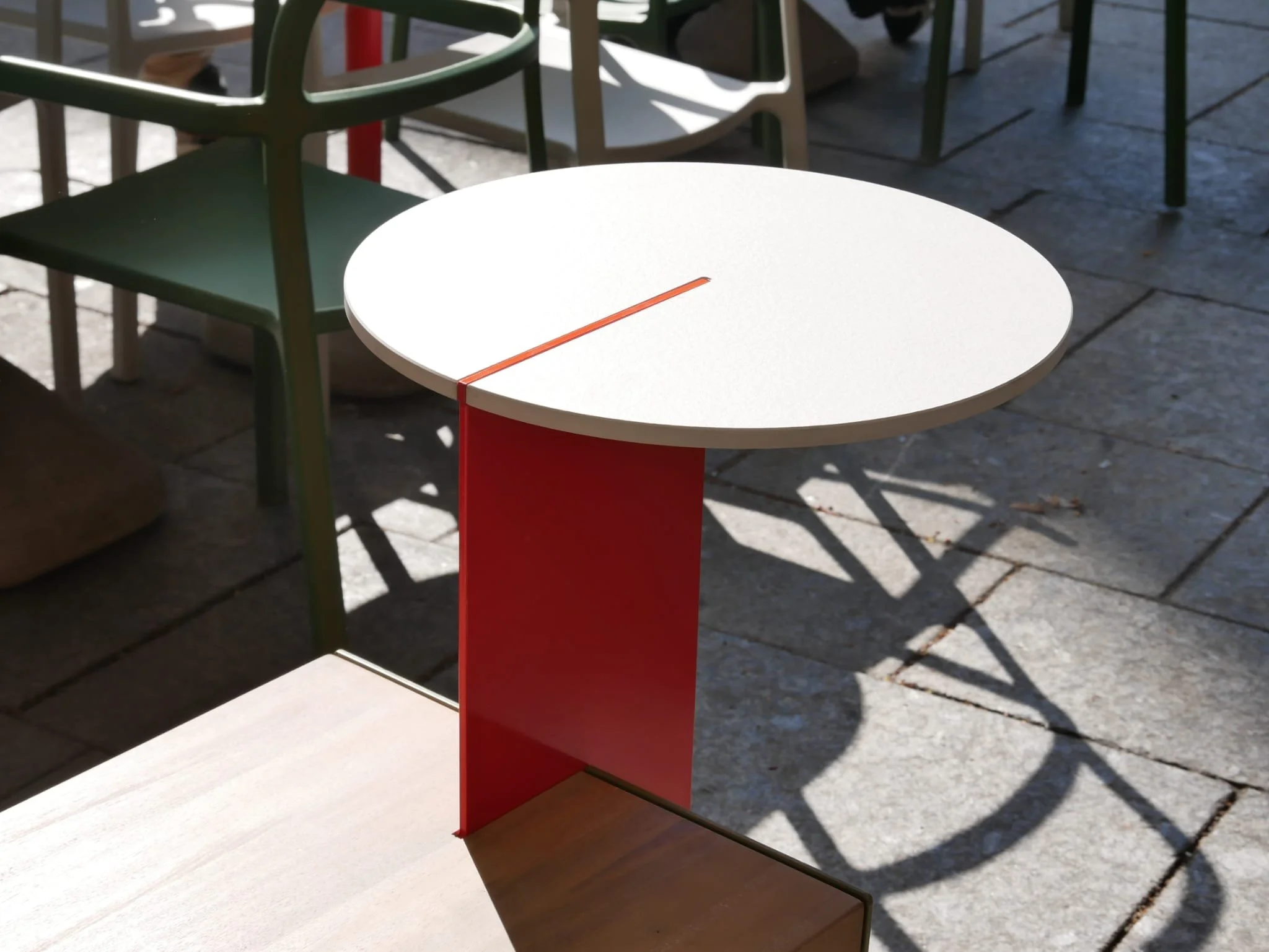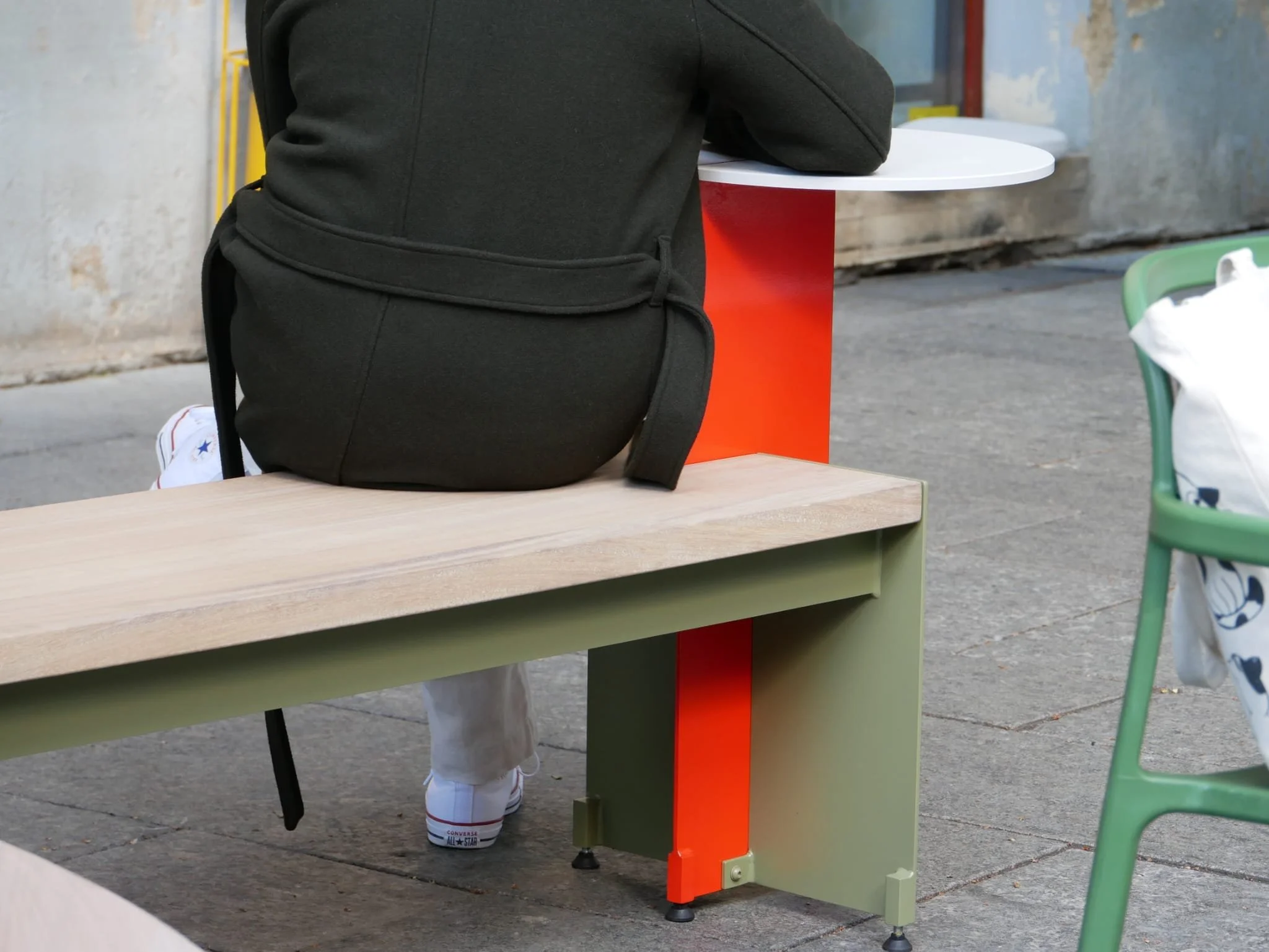 Materiality plays an essential role: warm wood, pleasant to the touch, combined with a solid and colorful metal structure, creates a playful yet refined contrast.